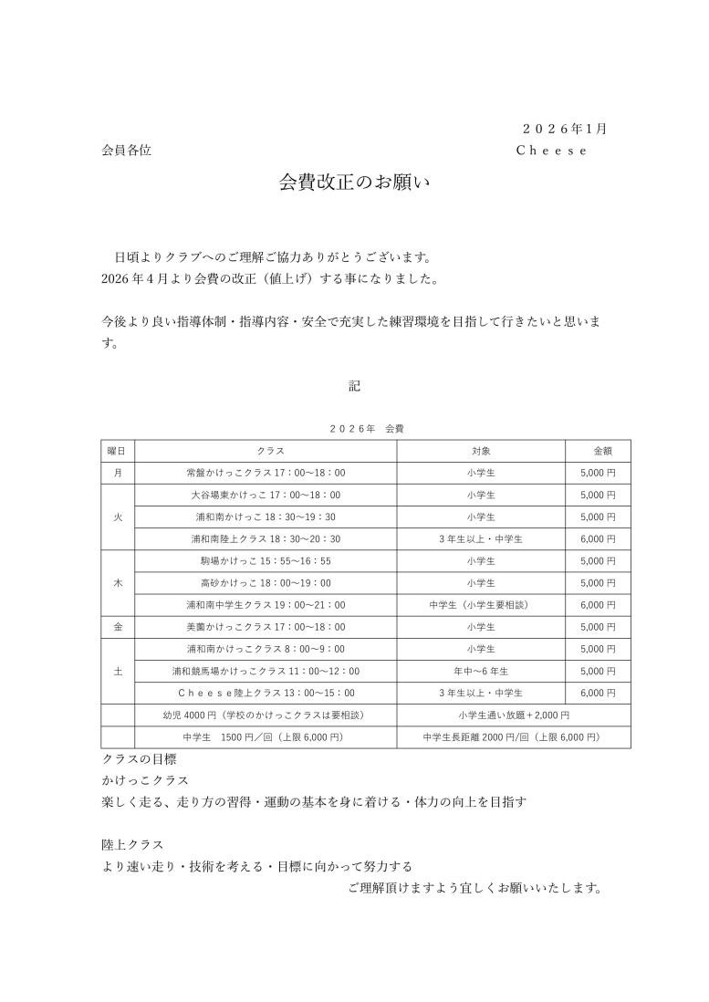 cheeseでは、子ども達を中心にかけっこを好きになって貰えるよう、私が幼稚園や小学校で指導を行う中で身につけた。子ども達のレベルに合わせた指導・分かりやすい運動の伝え方・やる気の出る言葉掛け・速く走る為のコツなど様々なテクニックを生かし「技術・体力の向上」により「今の自分より速く走る」事を目指します。